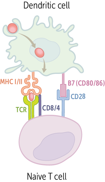 The immune system has a line of cells that target and destroy virally infected cells. They are called T-cells. But in order to identify virally cells, it needs three signals. One signal is the interaction of the T-cell receptor with the complex that presents a product from the virus. The second signal is the interaction of the T-cell co-receptor (CD8/4) with the same presenting complex. And the third signal is a costimulatory signal between a marker on the T-cell called CD28 and a molecule on the presenting cell called B7. See figure below.